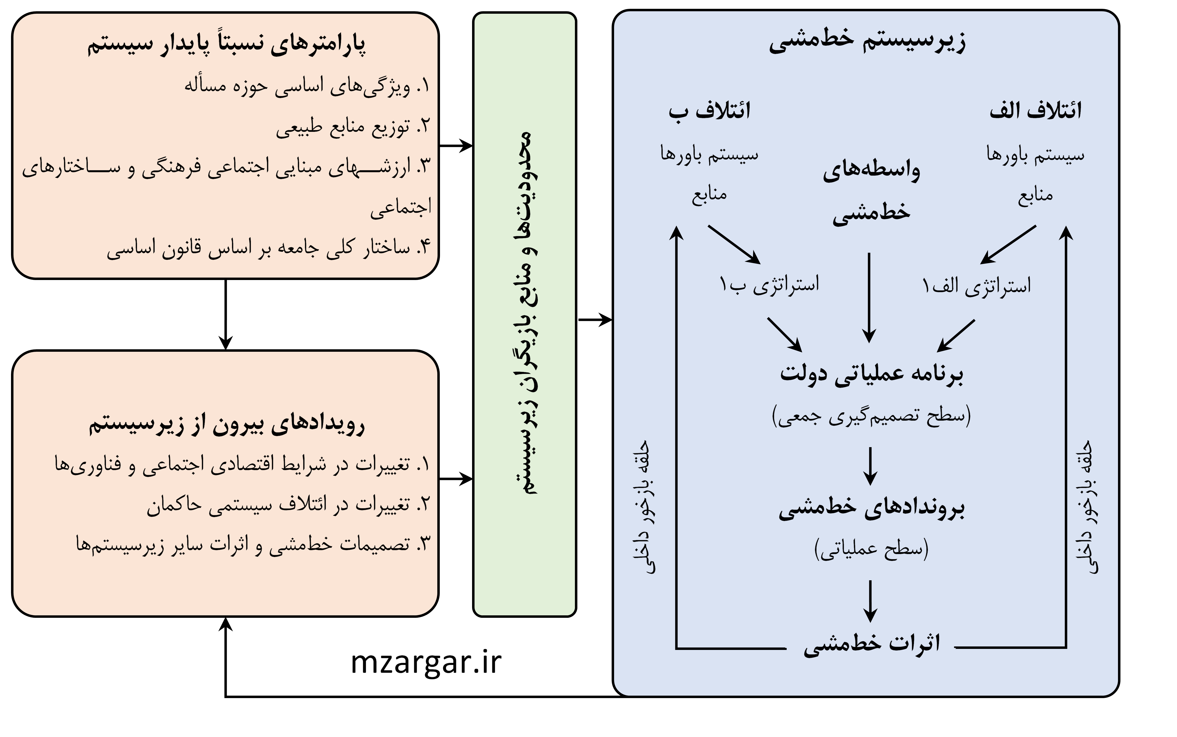 در تحلیل این مدل مفهومی میتوان بخش بیرونی زیرسیستم را در قالب رویکرد بالا به پایین و بخش درونی زیرسیستم را در قالب رویکرد پایین به بالا تحلیل کرد.