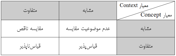 همانطور که در جدول فوق آمده است در مورد مفاهیم مشابه که در یک بستر معنایی واحد قرار دادند، اساساً انجام مقایسه موضوعیت نداشته و کاری غیر عقلایی است. به عنوان مثال اینکه بخواهیم مفهوم «محیط» را در بافت معنایی مدیریت بازرگانی با همین مفهوم در همین بافت معنایی مقایسه نماییم. مگر آنکه در زیرشاخههای گرایش بازرگانی بخواهیم مفهوم محیط را با هم مقایسه کنیم که البته آن امکانپذیر است.